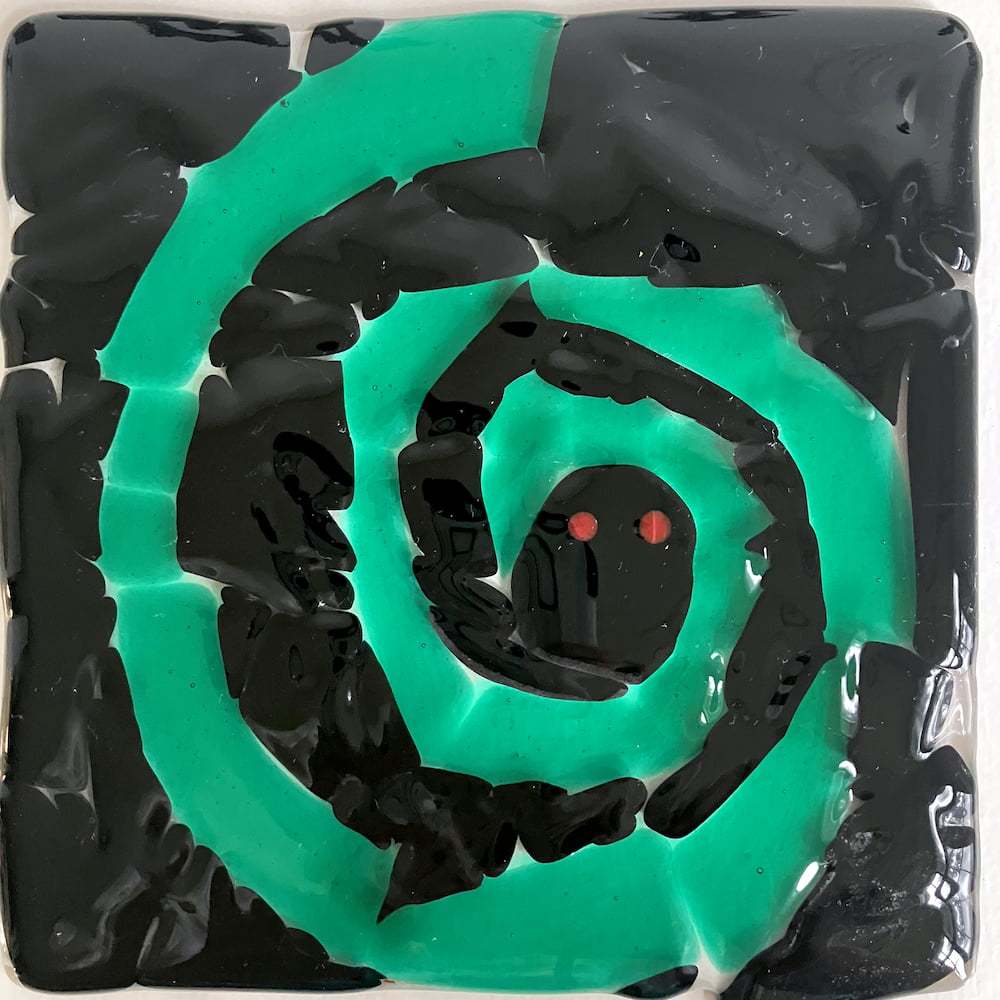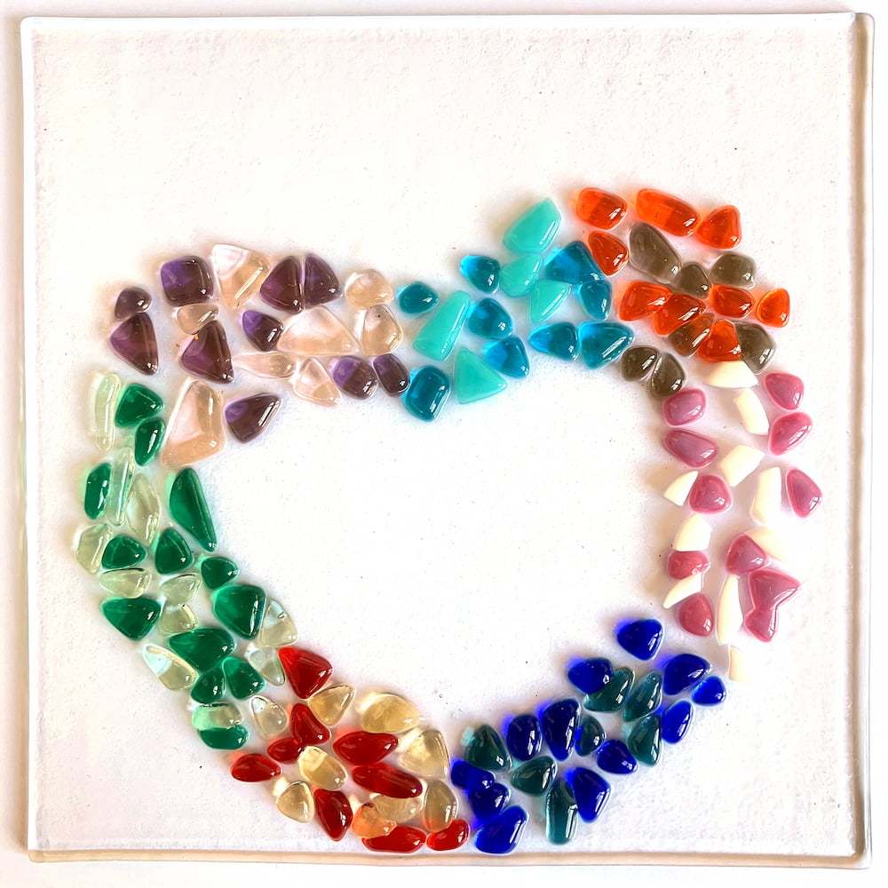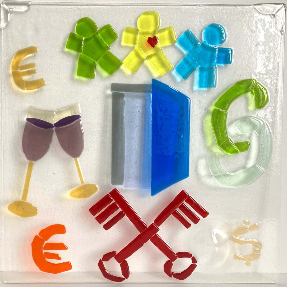 Een mooie tegel van glas. De werken worden gesmolten in een oven op 720-780 graden. Binnen 1 á 2 weken kan het worden opgehaald. Alles is dan ingepakt en van naam voorzien.