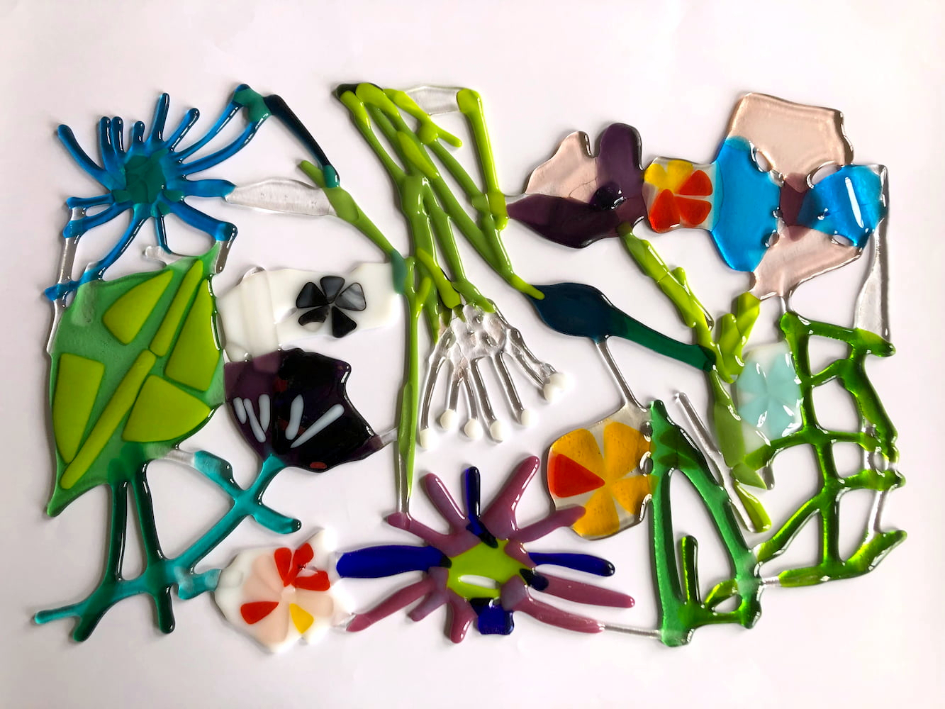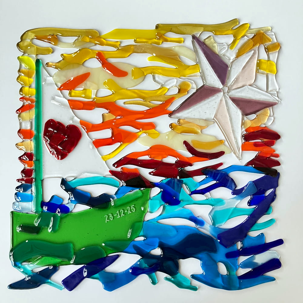 Je maakt een eigen werk in glas en leert daarbij de basis van glas snijden. Je werkt op een ovenplaat, waardoor je vrij van vorm kunt werken en kunt spelen met verschillende kleuren glas over elkaar.