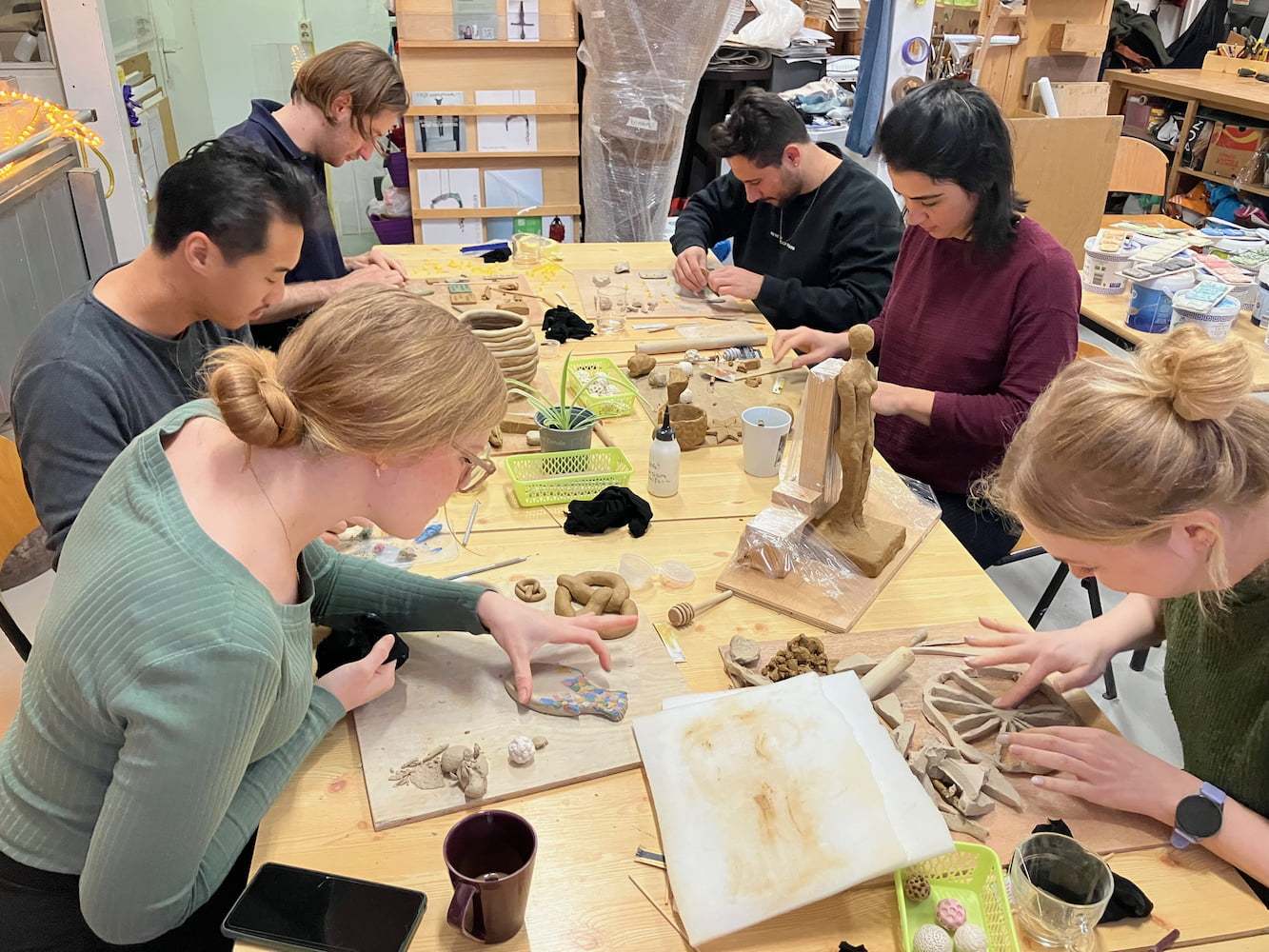 Je werkt niet in een gewone workshopruimte, maar in een echt kunstenaarsatelier, tussen kunstwerken, materialen en lopende projecten.